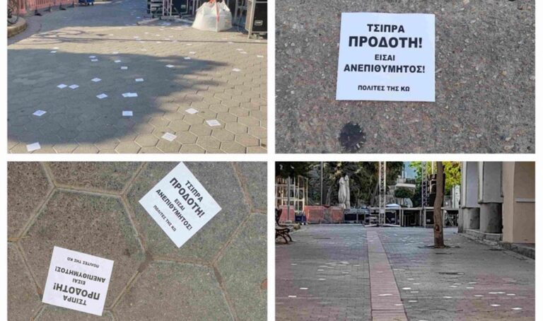 Πιο συγκεκριμένα τα χαρτάκια γράφουν ” Τσίπρα προδότη ! Είσαι ανεπιθύμητος! Πολίτες της Κω”.